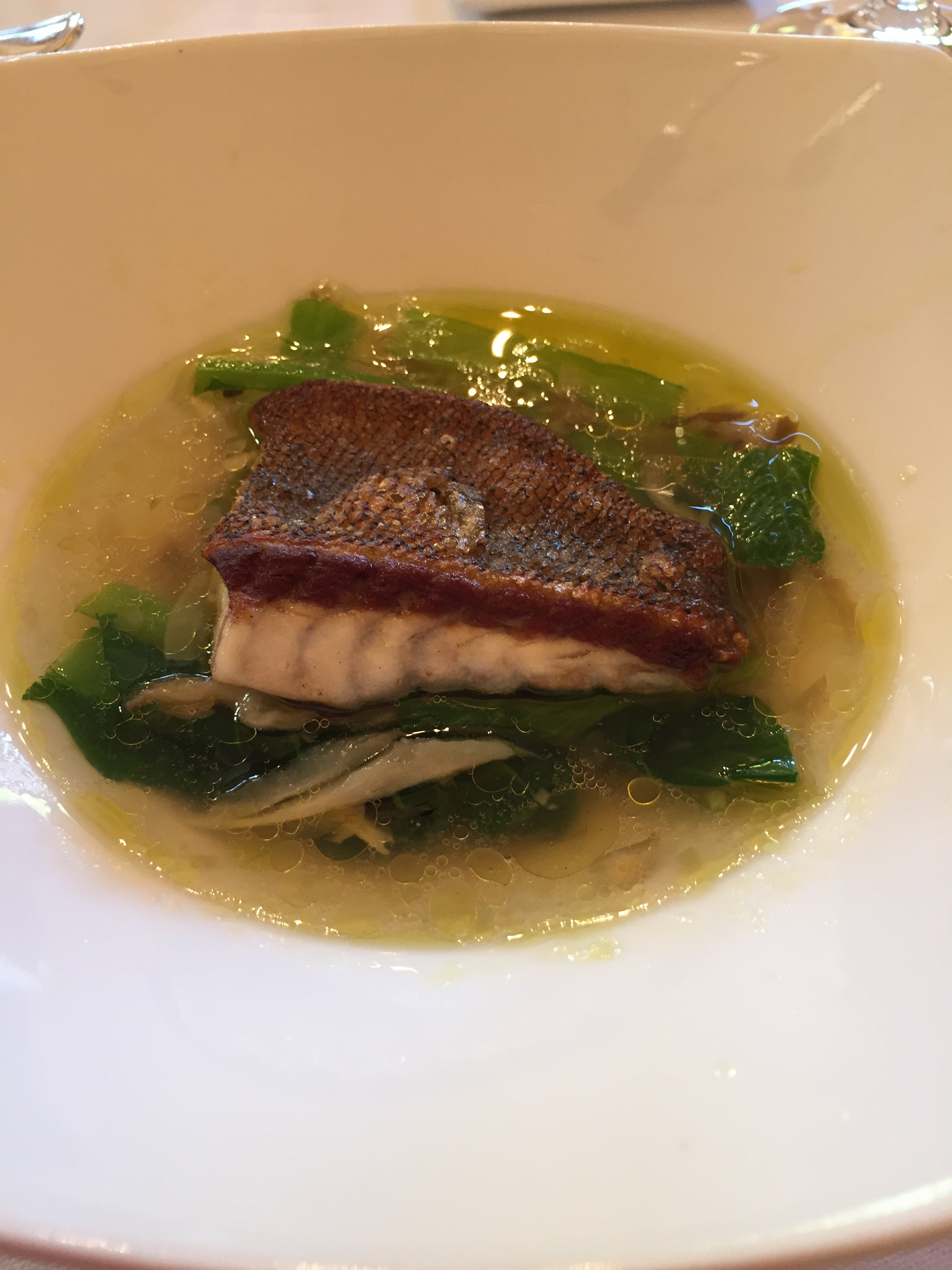 魚料理。ハタのコンソメ仕立て小松菜添え