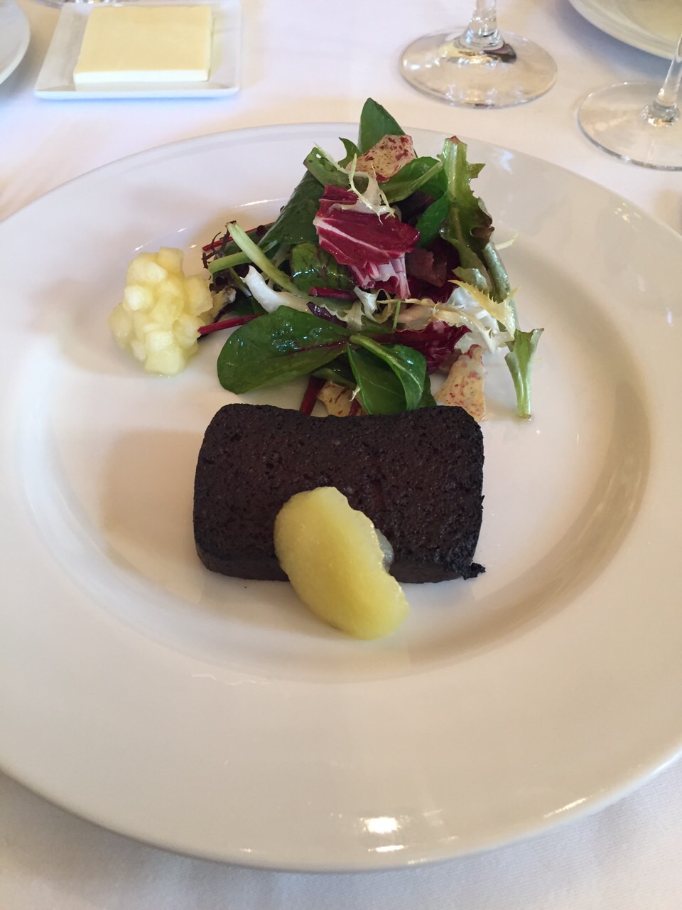 こちらは連れが頼んだ前菜。豚の血とフォアグラをテリーヌにしたものだそう。