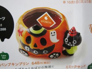 可愛いかぼちゃとおばけの陶器に入ったパンプキンプリン。