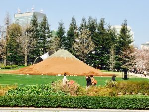 この富士山の素材は街路樹などの剪定材をチップ化したバーク堆肥などを使用し、