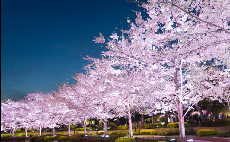 昼はビル群の中で青く抜けた空の下、夜はライトアップされた桜を見上げて、都会的なお花見が楽しめます。