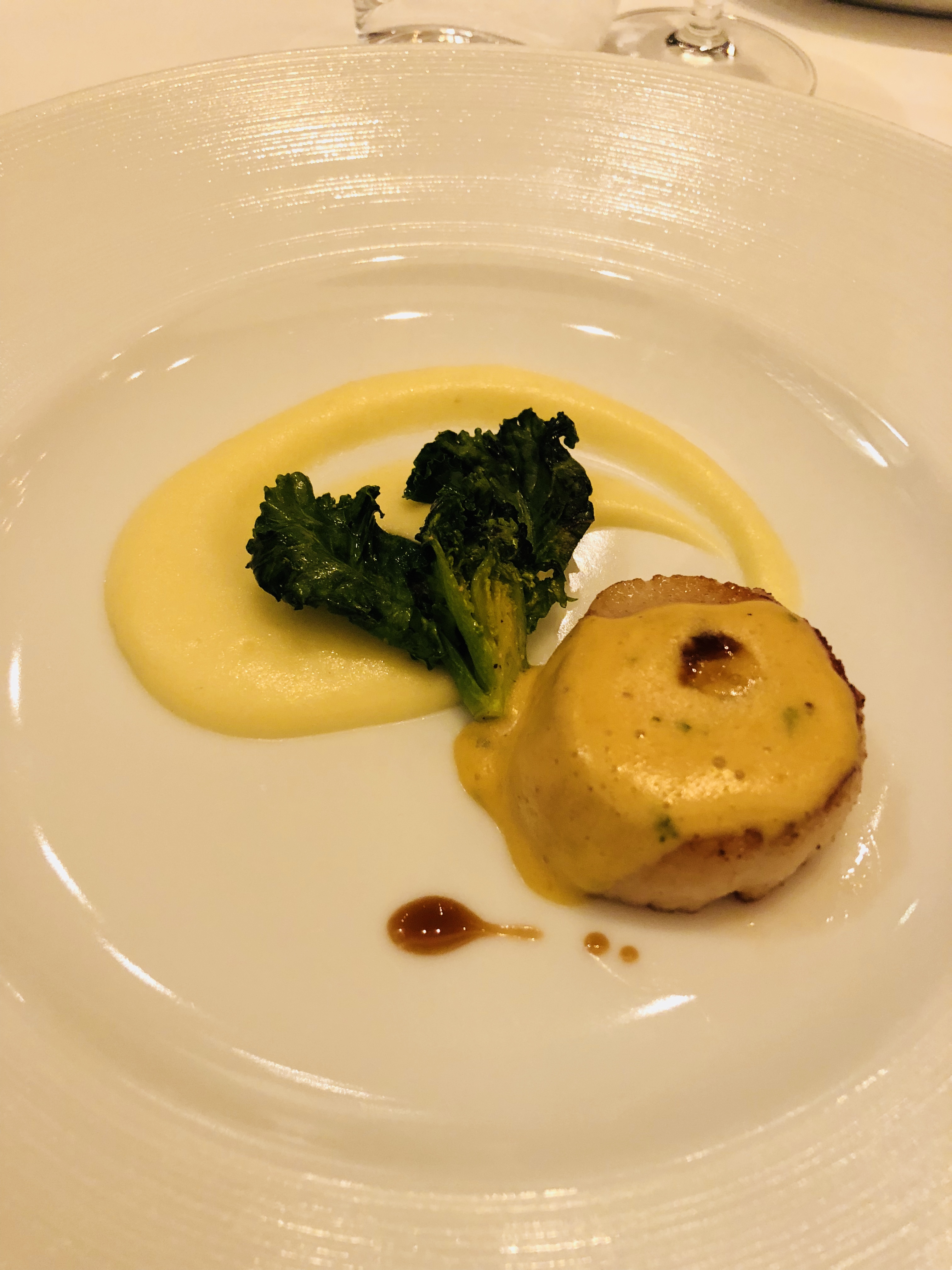 高温で炒めたホタテとムースリーヌポテト フォワイヨソース