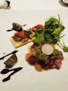 前菜は「焼きなすとドライトマトのタルト 巨砲の香るバルサミコソース
