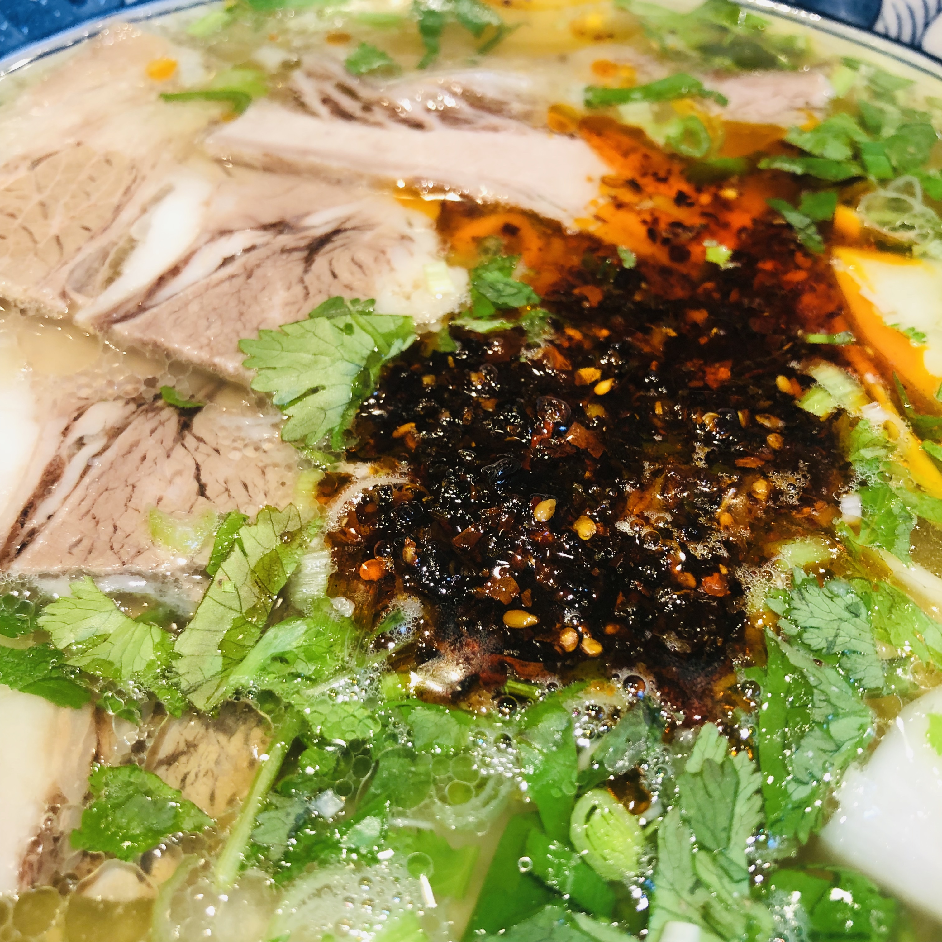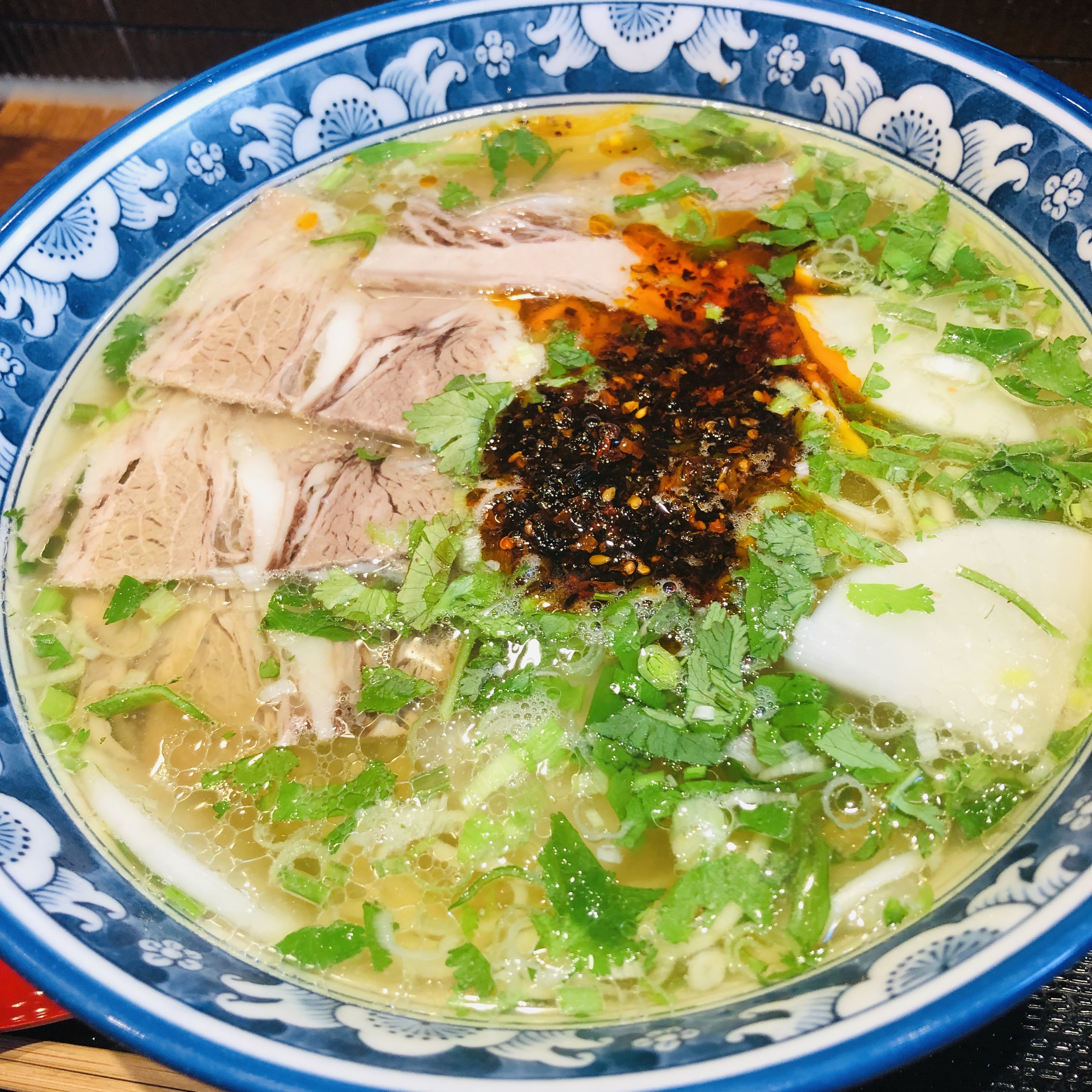 透き通ったスープは牛骨のしっかりしたダシが効いていてなかなか深いです。