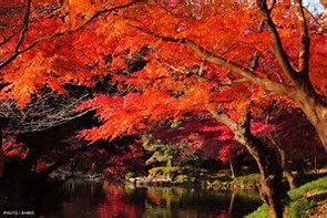 日本庭園の心字池周辺にあるハゼやカエデ、モミジの