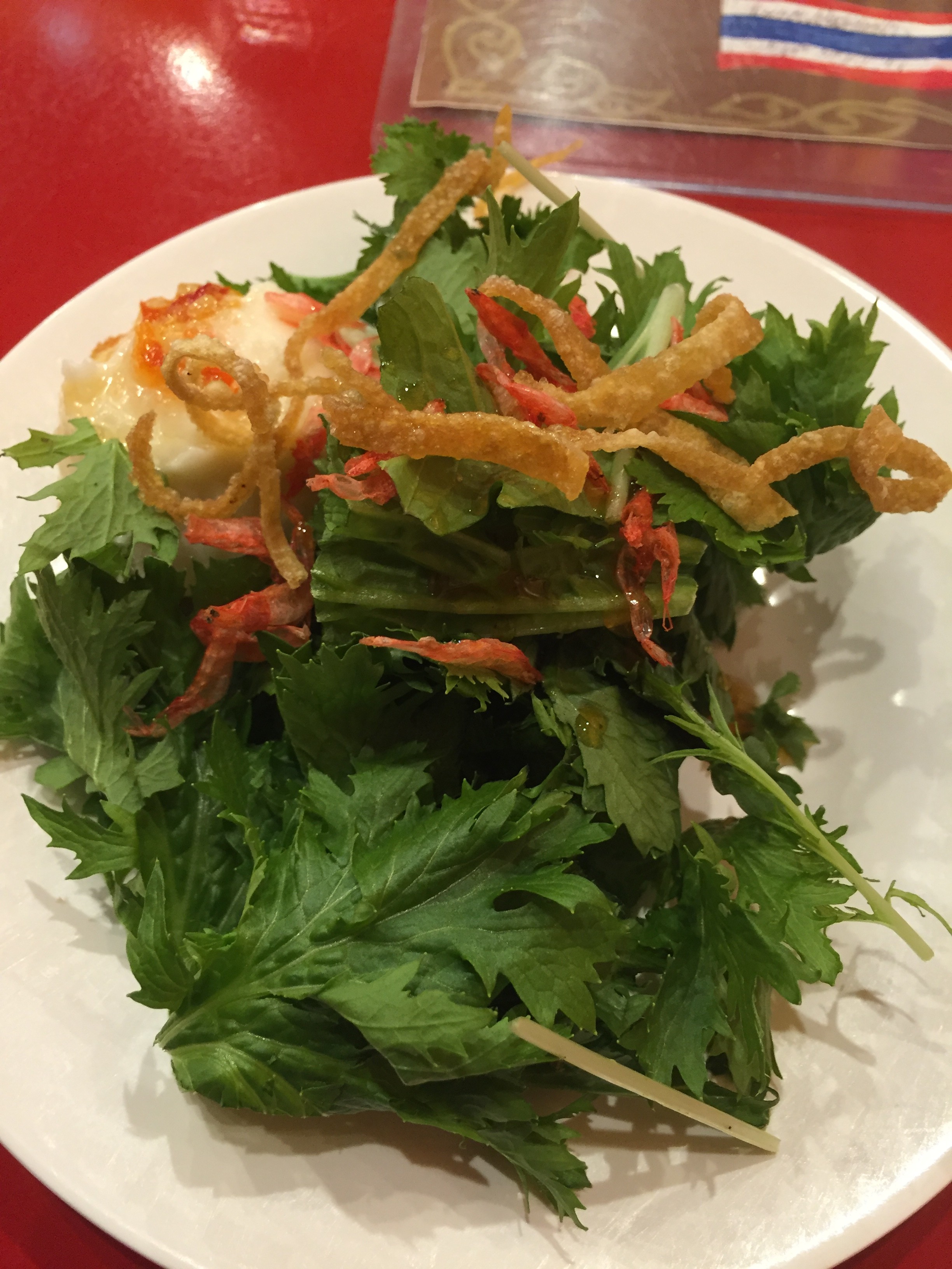 このサラダ、タイ風のポテトサラダにたくさんのパクチーに