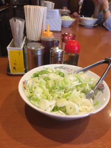 カウンターには調味料とともに丼ぶりに山もりのネギが!