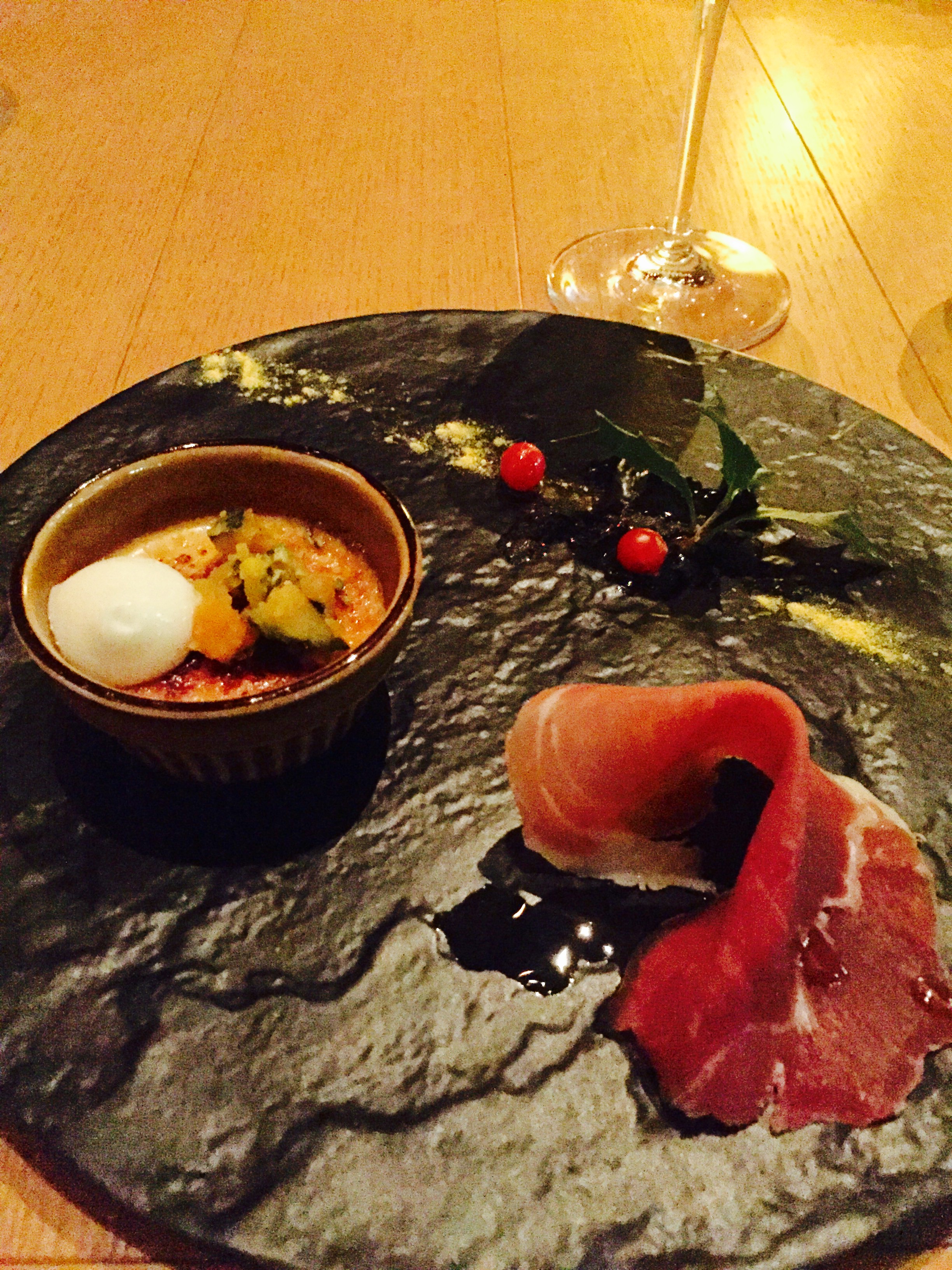 前菜1 「栗カボチャのカタラーナ」 サンダルエール産生ハム添え