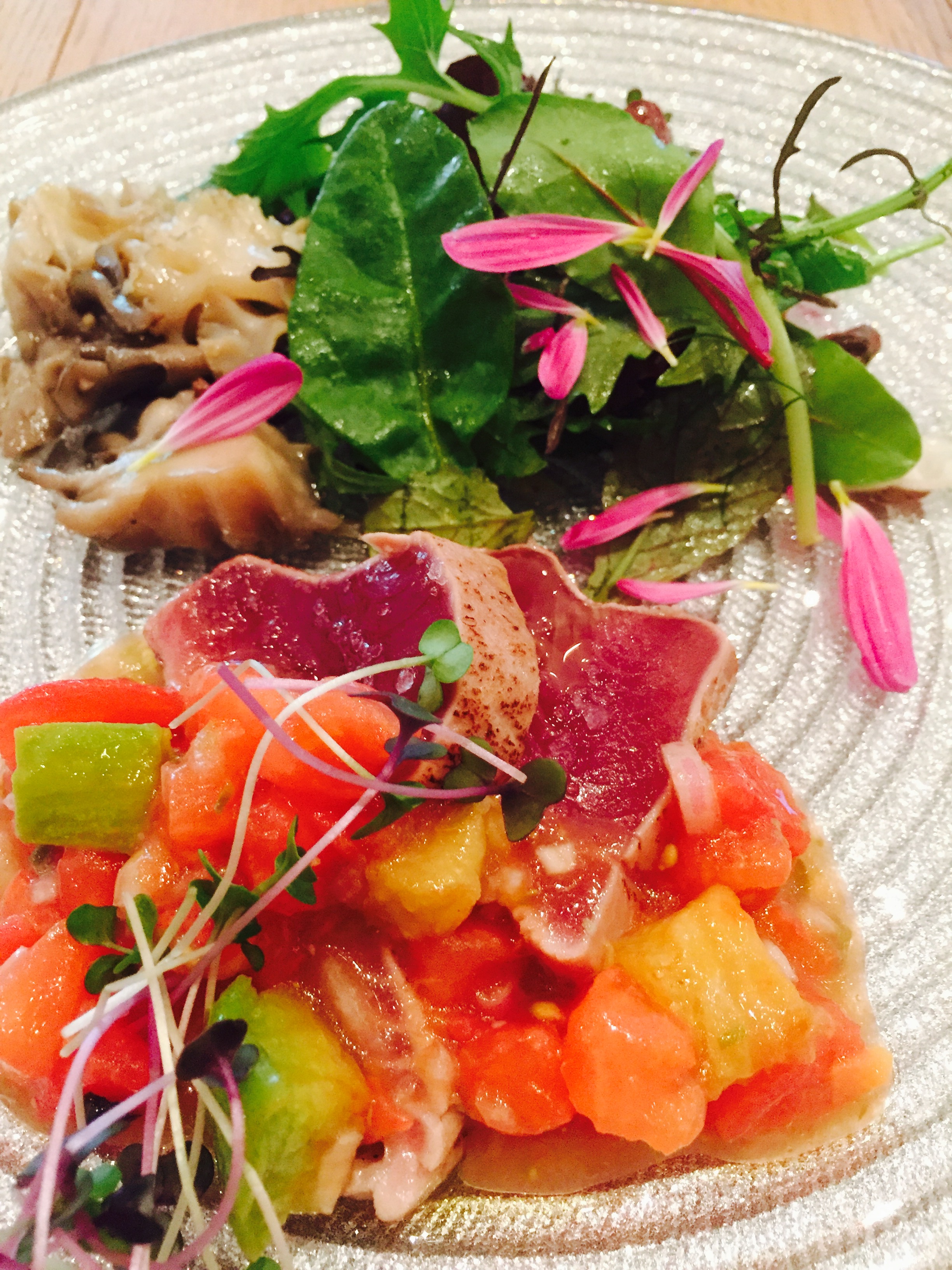 炙りカツオのカルパッチョ・トマト茄子のマリネソース