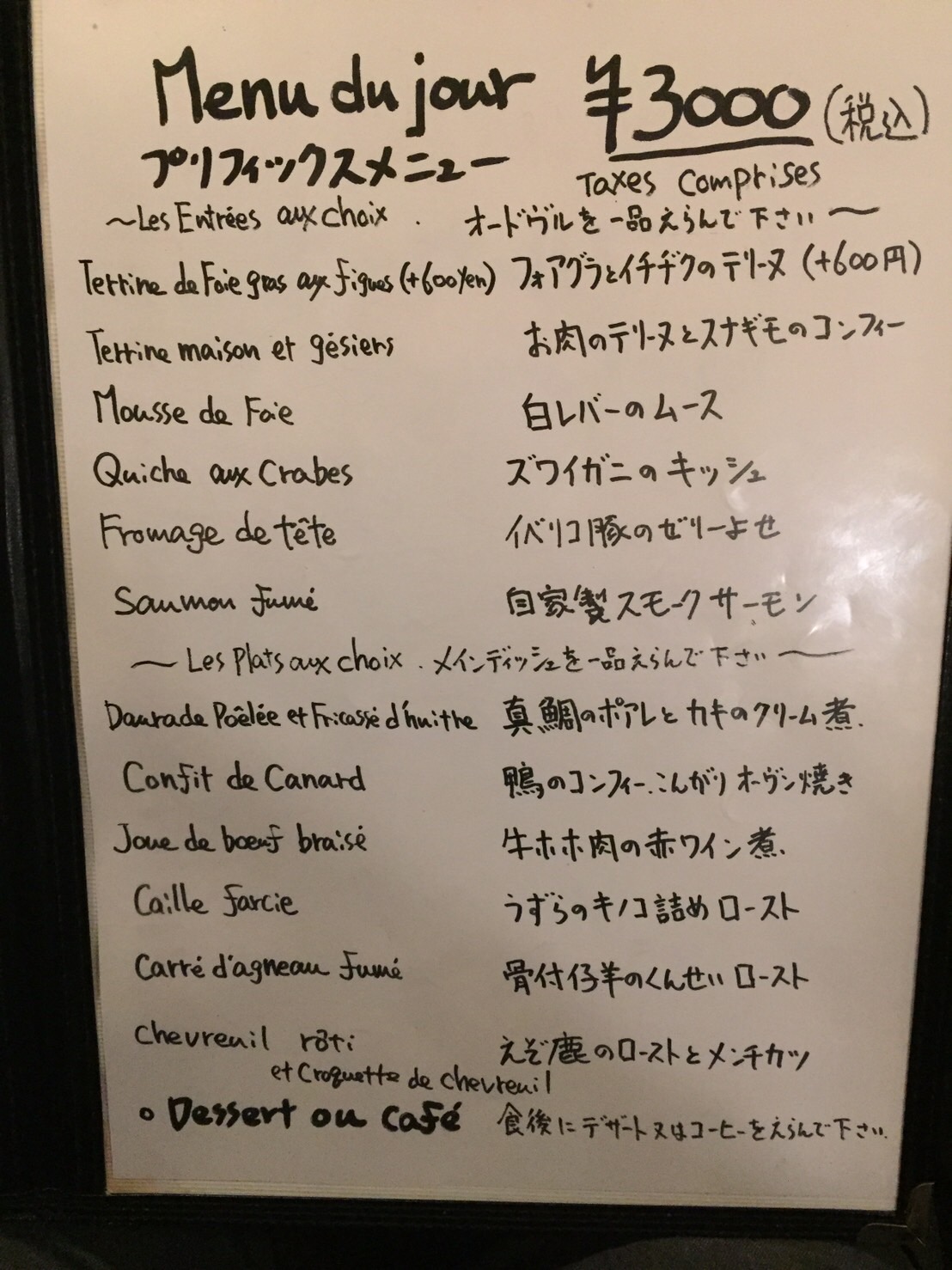ディナーはコースで3,000円税込み。