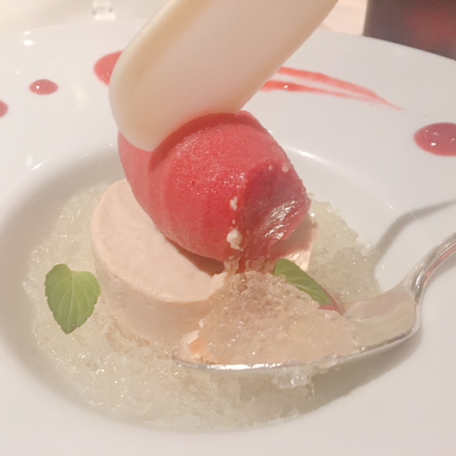 「ブレンドティーのムース 赤桃のソルベ添え」