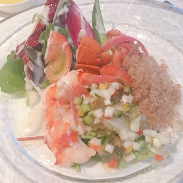 次に「オマール海老とホタテのサラダ風コンソメとガスパチョとともに」