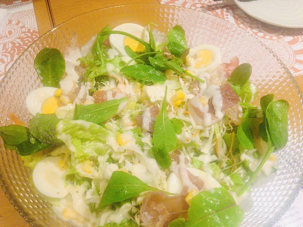 まずは「温玉乗せ生ハムシーザーサラダ」