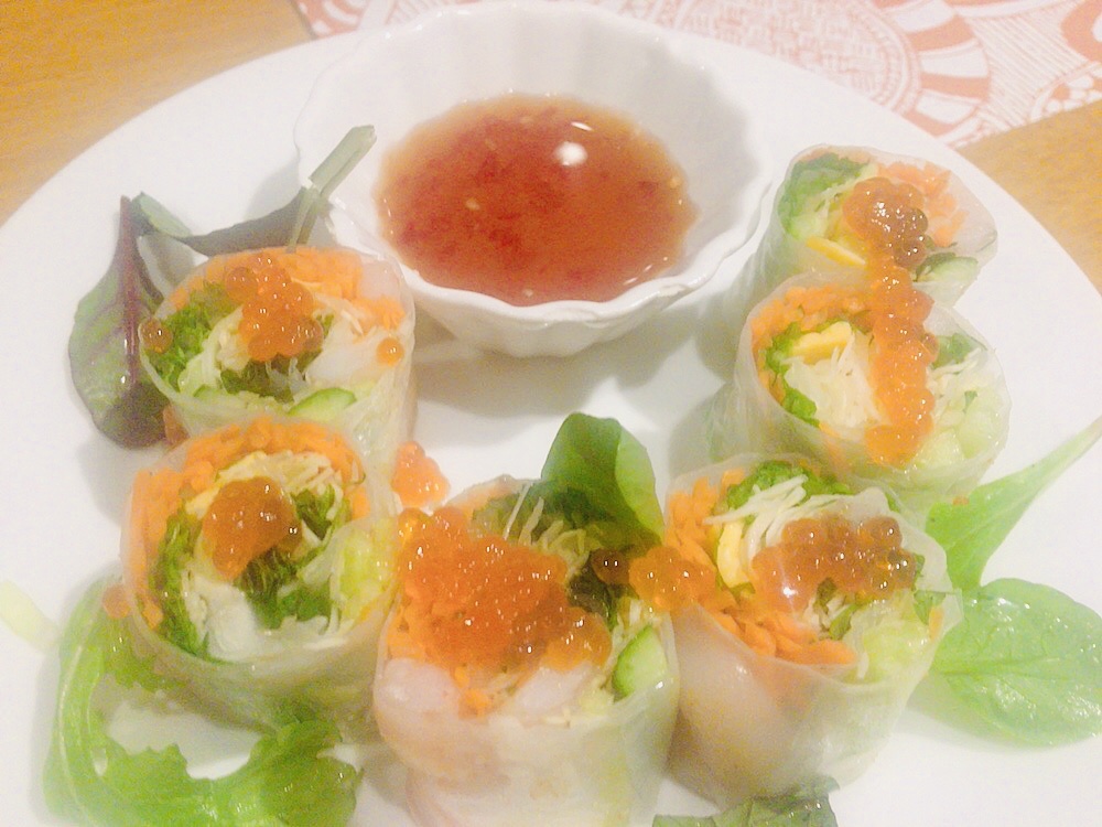 お次は冷菜で「イクラ乗せ海老入り具沢山生春巻き」