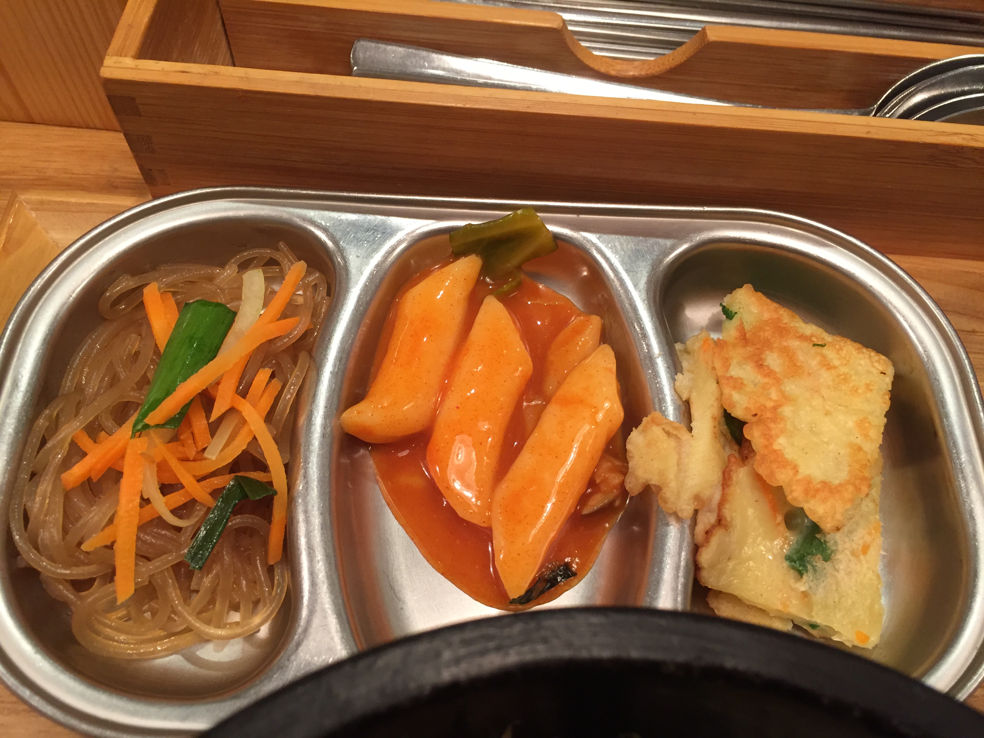 チャプチェ、トッポギ、チヂミのおかず付きです。