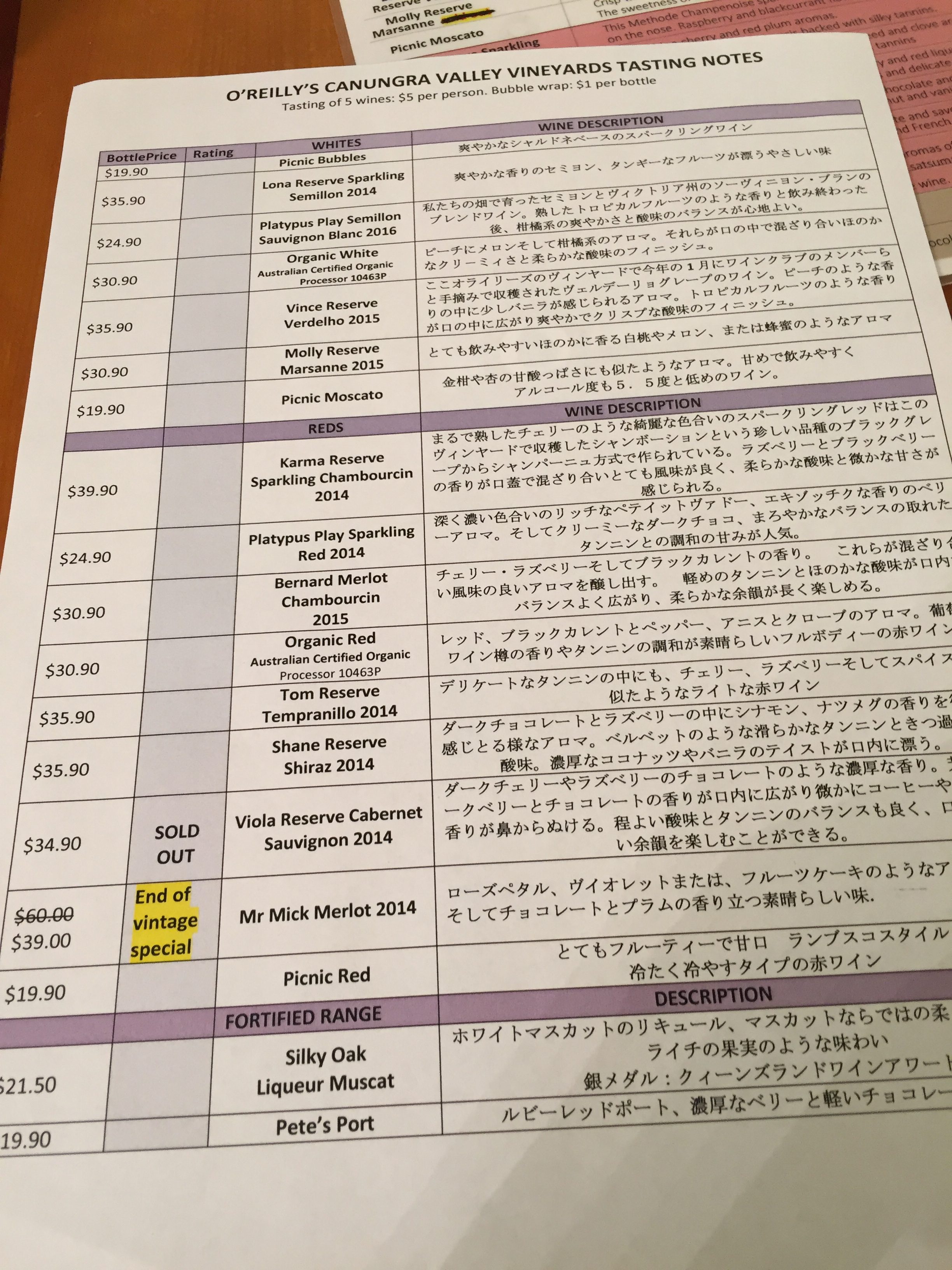 1人AU3$で5種類のワインのテースティングが出来ます。
