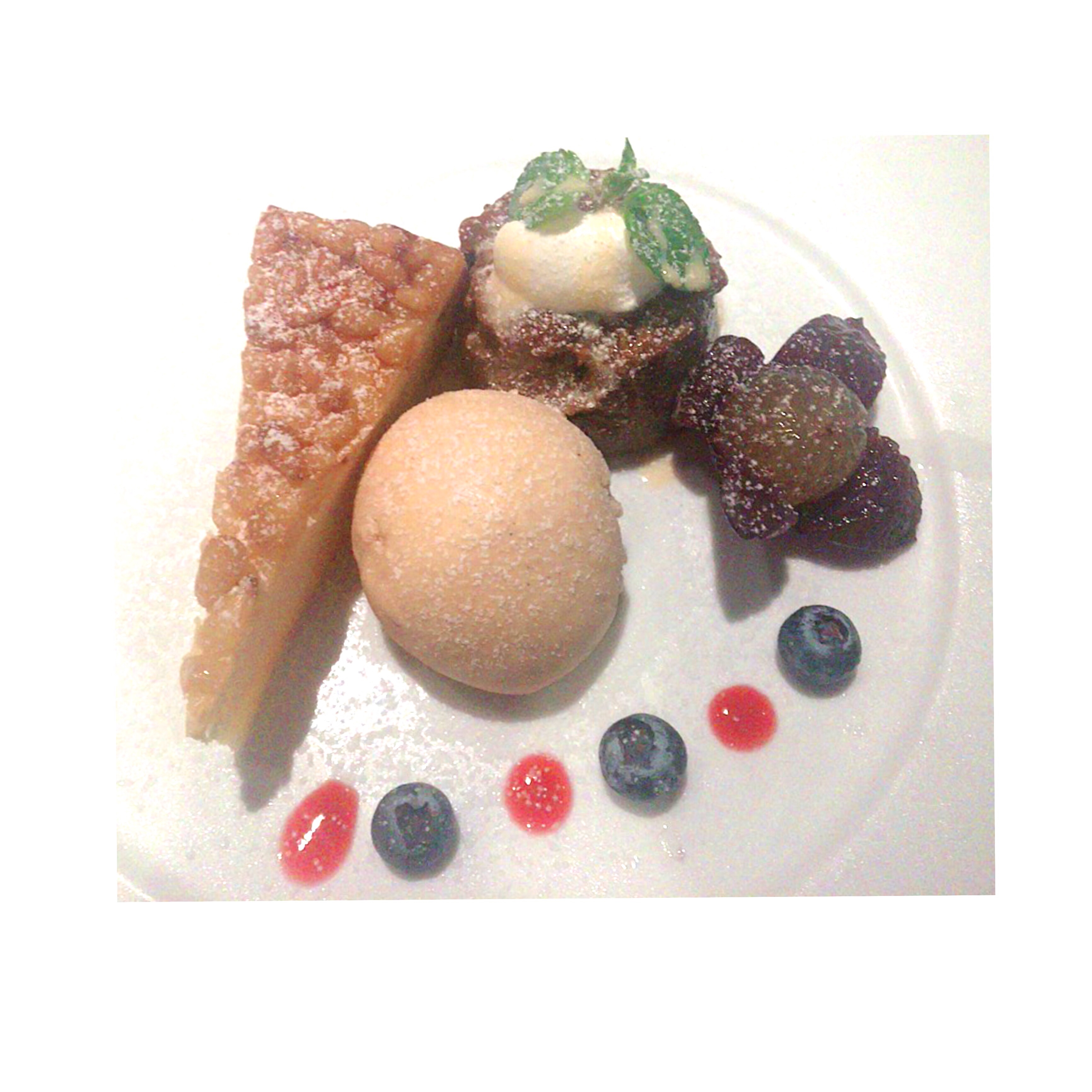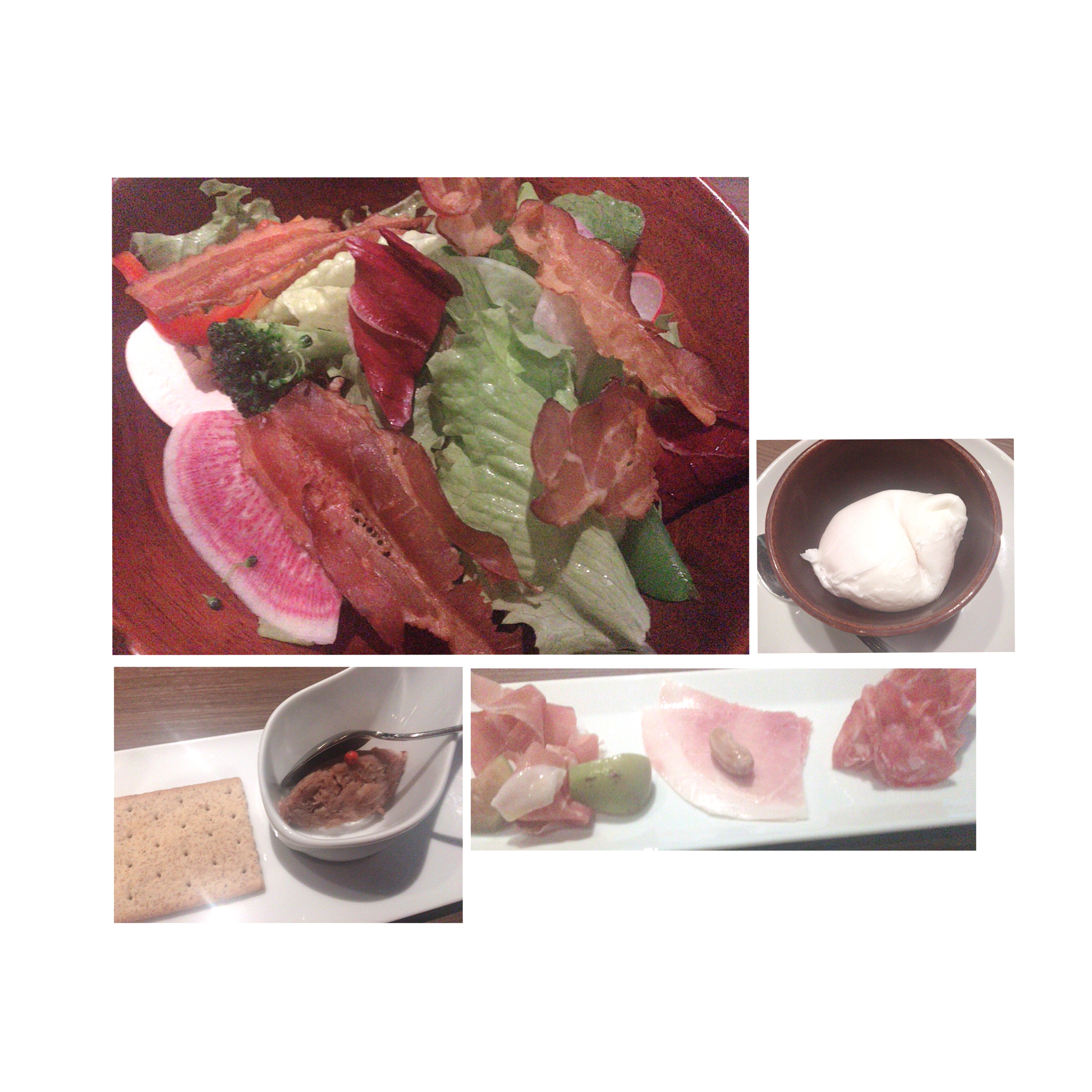 テリーヌ、本日のオードブルの盛り合わせ、ポーチドエッグ、特製旬彩サラダ。