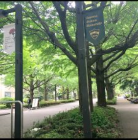 青山通りに面した正門からのイチョウ並木の新緑が