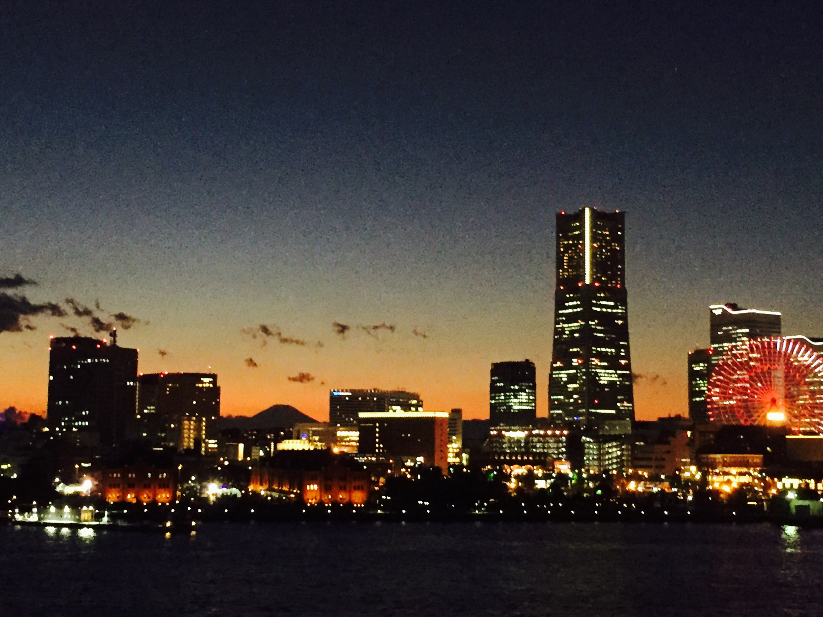 大さん橋の反対側を見ると、美しいみなとみらいの夕景が