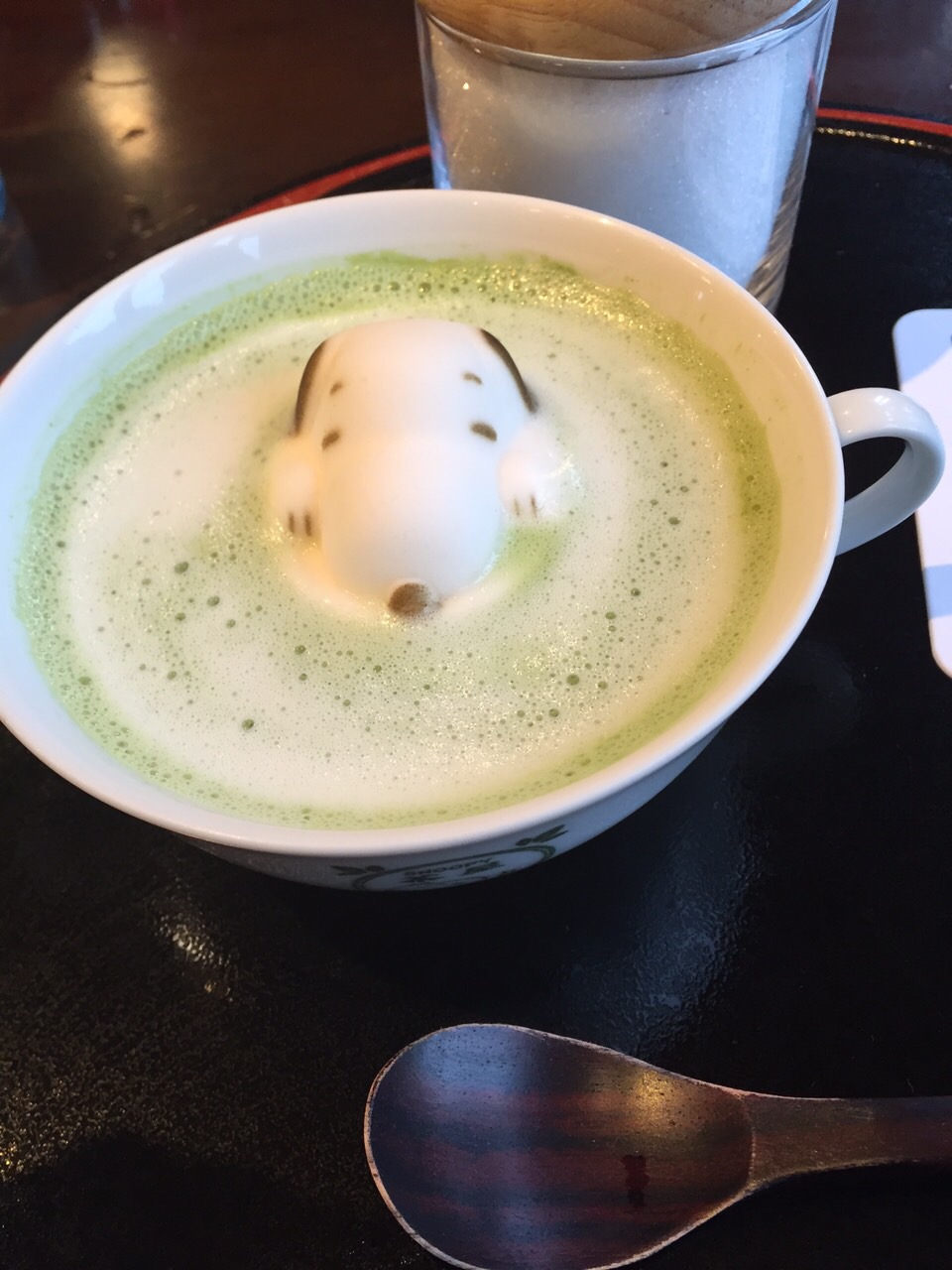 抹茶オーレに浮かんでるスヌーピーはマシュマロで